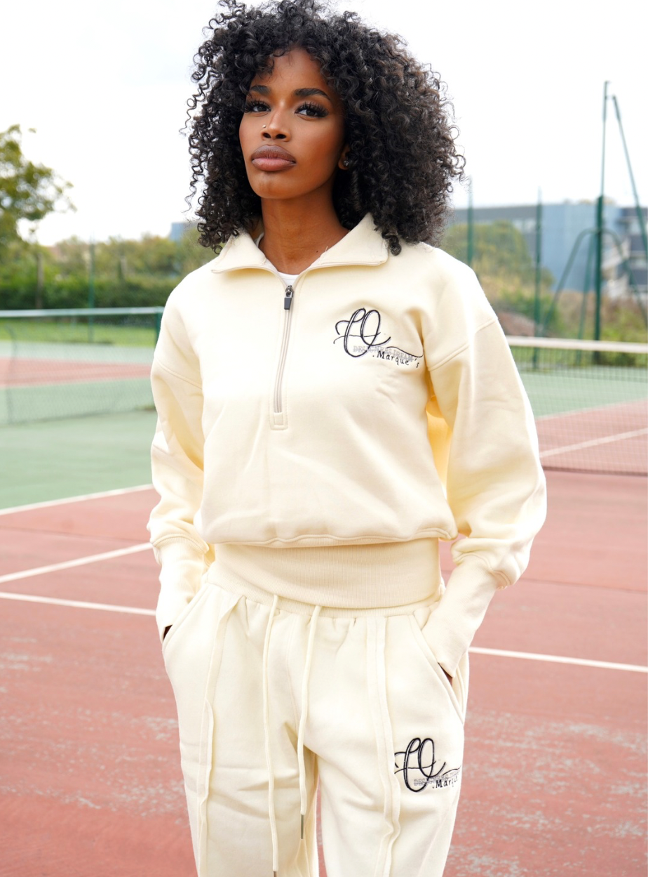 Soft Énergie incarne un parfait équilibre entre confort et élégance décontractée. Conçu dans une matière douce et structurée, il offre un tombé fluide qui épouse le mouvement tout en gardant une allure affirmée.Le haut présente une fermeture zippée partielle et un col montant, apportant une touche moderne et sportive. Sa coupe légèrement croppée met en valeur la silhouette sans compromettre le confort. Le bas, à la coupe oversize, est doté d’une taille élastique et de cordons ajustables aux embouts métalliques raffinés, pour une finition soignée.
